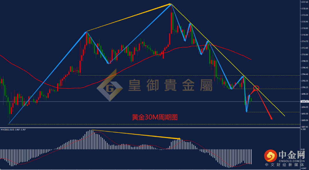 从下图的黄金30M周期图来看,昨日早盘黄金最高攀升至1726.5一线,在高位形成MACD顶背离信号后,金价开始受压回落,在成功跌破60均线重要支撑位后,就开始加速下跌,整体沿着下降趋势线一路向下运行,最低下挫至1692.5一线,中途屡次反弹至趋势线附近均受阻回落,多头反弹力度弱。目前金价仍处于趋势线下方运行,空头趋势还在延续中,日内关注上方压力1700、1704,下方支撑1692.5、1689,操作上建议反弹至压力位附近尝试空单。