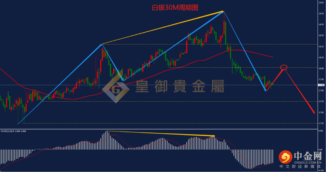 从下图白银30M周期图来看,前期白银在17.54一线迎来超跌反弹,成功站稳60均线后,银价便围绕着60均线震荡上行,昨日银价最高上冲至18.57一线,在高位形成MACD顶背离信号后,行情便迎来急速下跌,空头势头凶猛,直线下破60均线的重要支撑,最低下挫至17.84一线。目前银价仍处于60均线下方运行,MACD也处于0轴下方运行,空头趋势较强。日内关注上方压力18.17、18.37,下方支撑17.75、17.55,操作上建议反弹做空为主。