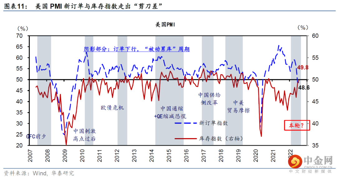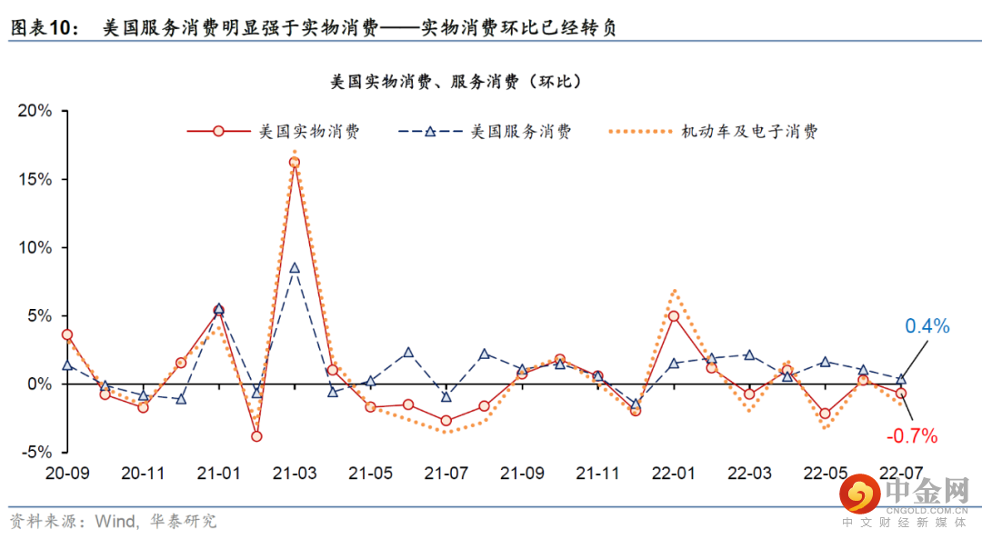 从美国高频数据分析,美国实物消费动能快速减弱,且制造业出现“被动累库”迹象。随着高通胀下美国居民真实收入水平大幅下降,美国实物消费7月环比下降0.7%;从去年5月~今年7月份(共15个月份)当中,实物消费环比增速在其中11个月份都跑输服务消费增长(图表10)。另一方面,美国制造业开始出现“被动累库”的早期迹象,表现为订单增长大幅降速、且高于库存降速速度,导致库存比例上升,如美国国内贸易库存销售比已明显回升(图表11)。