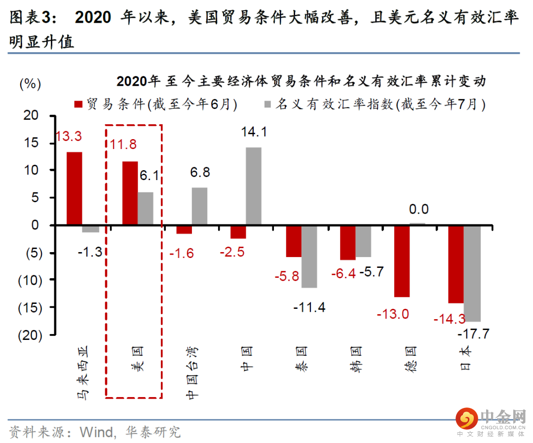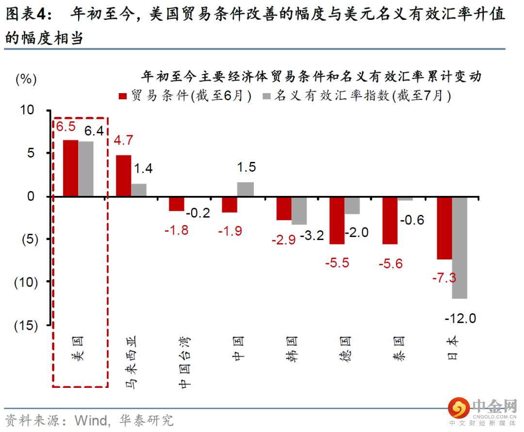 从基本面角度看,美元走强是美国贸易条件改善、以及全球避险需求上升的共同结果。俄乌战争爆发以来,美元流动性“波浪式”收紧步伐加快,尤其是美元走势和油价相关性明显升高,反映贸易条件改善对汇率的支撑(图表2)。由于美国出口中高科技产品、能源等商品的占比更高,疫情爆发以来、尤其是俄乌冲突升级后,美国贸易条件明显改善,推动美元名义有效汇率走强(图表3和4)。此外,全球衰退预期升温,市场风险偏好走低,也在一定程度上推升美元汇率。