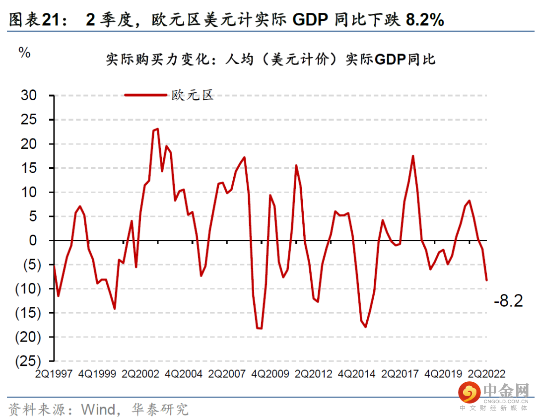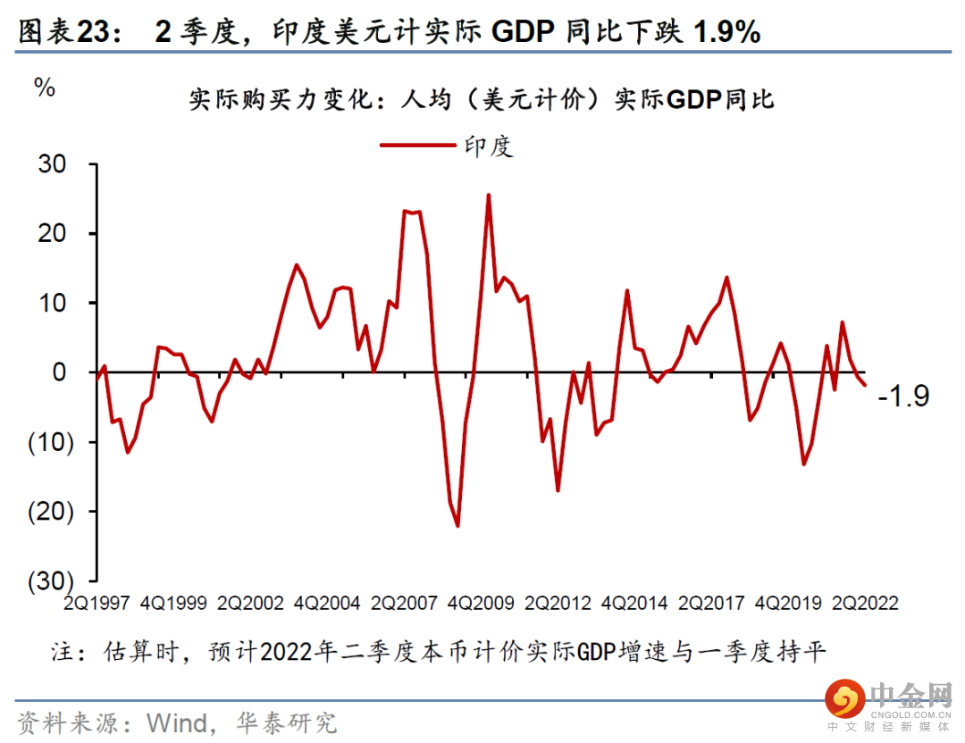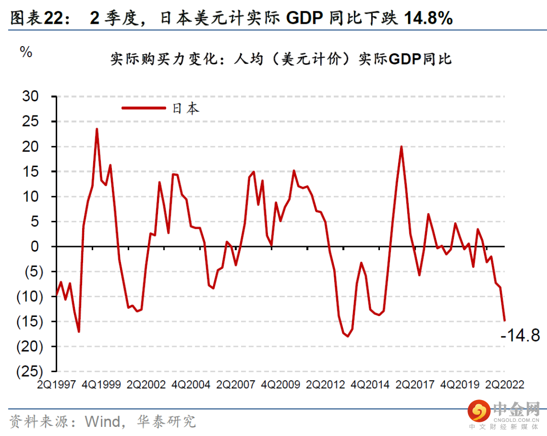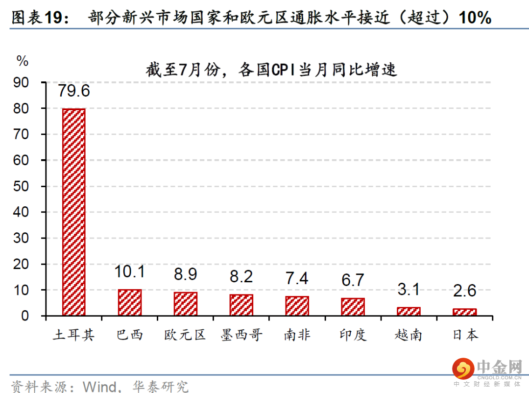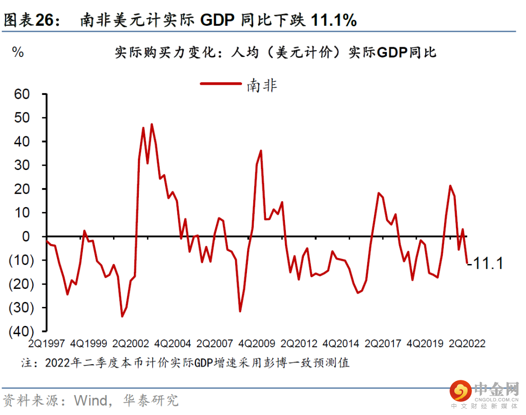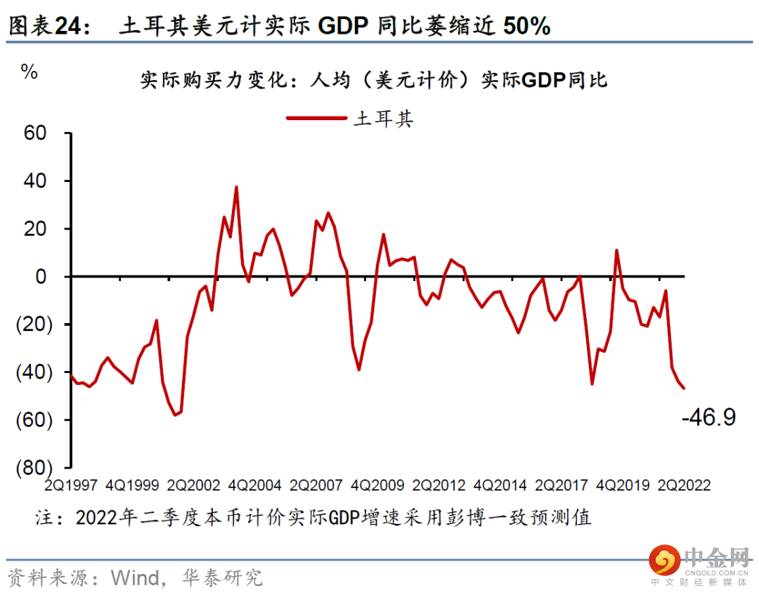 全球美元计的真实购买力可能继续下行。今年以来,能源价格上升,大多国家的贸易项下转为逆差、贸易条件快速恶化、对美元明显贬值。新兴市场国家的贬值幅度更大。目前,欧洲以美元计价的“实际购买力”同比跌近一成,日本下跌更多,而新兴市场以美元计真实购买力下降3-5成的比比皆是(图表19-26)。如果能源价格在供给冲击下上涨、并推动美元指数进一步升值,那么欧洲、日本、韩国等贸易条件恶化的大国美元购买力(进口需求)将进一步下探。而新兴市场国家购买力的“消失”速度将成倍于OECD国家。