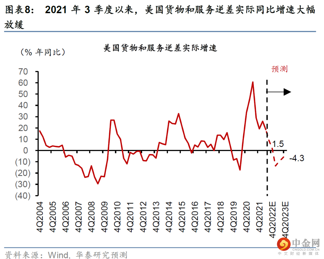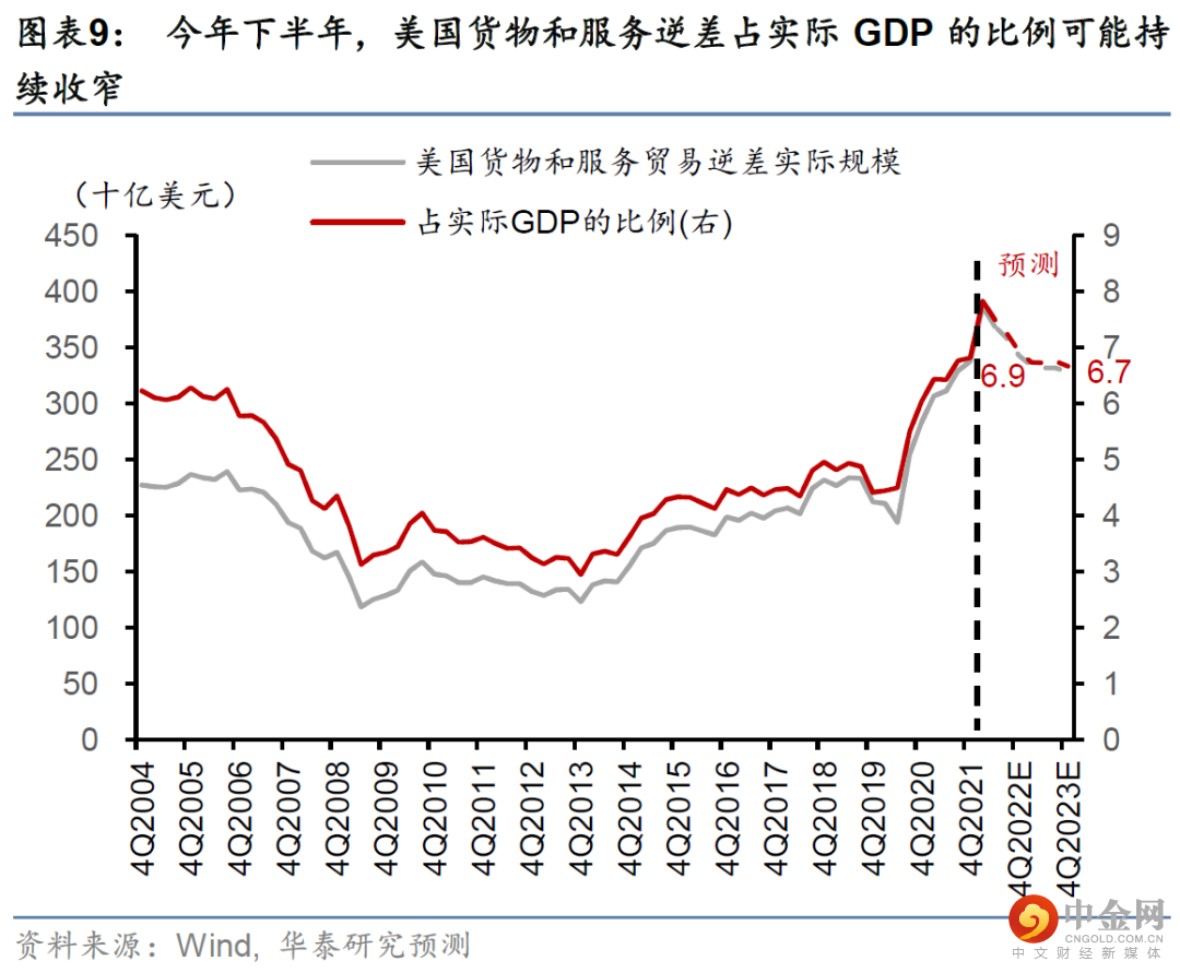 美国贸易逆差可能收窄,继续减少对全球的美元输出。美国贸易逆差和全球美元流动性、尤其新兴市场资本流入正相关(图表7)。2021年2季度以来,随着美国增长放缓,作为全球美元供给主要渠道之一的美国贸易逆差增长也明显放缓。随着财政补贴退坡,美国货物和服务逆差实际同比增速从2021年2季度的60.6%大幅放缓至2022年2季度的18.5%,我们预计今年底可能继续下降至1.5%(图表8和9)。