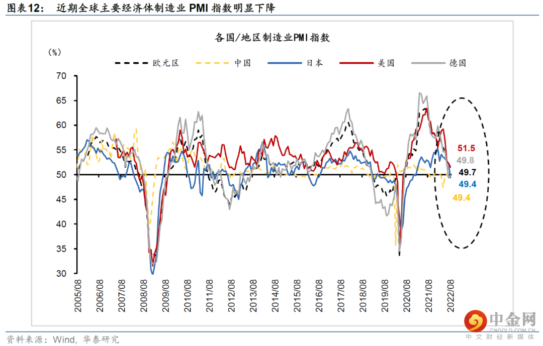 美国进口的领先指标、以及韩国出口、全球PMI等一系列数据都显示,美国进口需求减弱,逆差将缩窄。今年8月美国ISM制造业PMI新订单指数略有回升至51.3%,但较2021年3月68.0%的高点、以及年初的57.9%均大幅下滑;美国除国防外耐用品新增订单环比增速从年初3.0%的增幅明显降温至今年7月的1.2%,美国零售环比增速也从年初2.7%的增长大幅放缓至今年7月的环比持平。全球贸易的“风向标”韩国出口动能快速下降。8月韩国出口同比增速较上月下滑2.6个百分点至6.6%,而考虑开工天数的日均出口额同比由上月的14.1%大幅下降至2.2%。此外,近期全球主要经济体制造业PMI指数均明显下行,显示美国进口需求将减弱、美国贸易逆差将缩窄(图表12)。