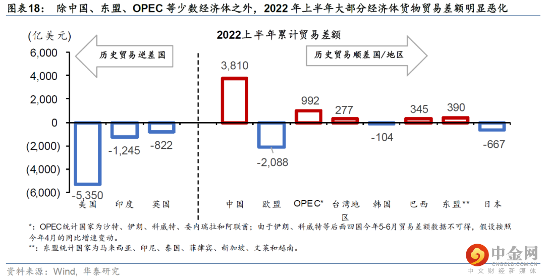 如果油价在供给冲击下进一步上升,那么美元在不同经济体间的分布将更不均衡,反而可能进一步加剧结构性美元短缺。俄乌战争后,能源供给冲击带来贸易条件的巨大变化,多数制造业国家成本飙升、无力再赚取顺差。同时,美国疫情后的强刺激叠加中国的“弱内需”,推升中国出口增长但压制中国进口需求,进一步加剧流动性在少数经济体“淤积”。由此美元供给分布变得极不均衡,且循环不畅(图表17和18)。如果能源价格在供给推动下上升(即无需求和制造业出口需求支撑),会收紧总体美元流动性,并加剧美元“分布不均”的现象。