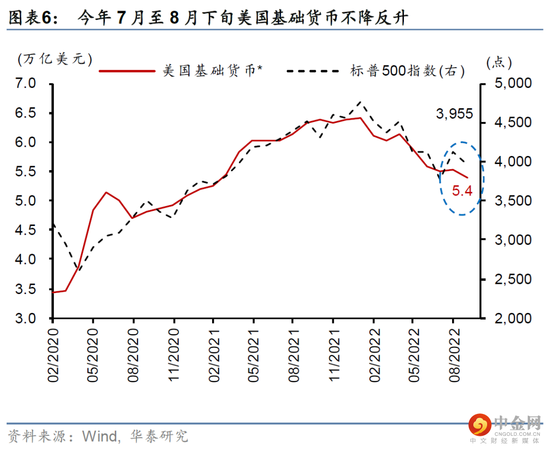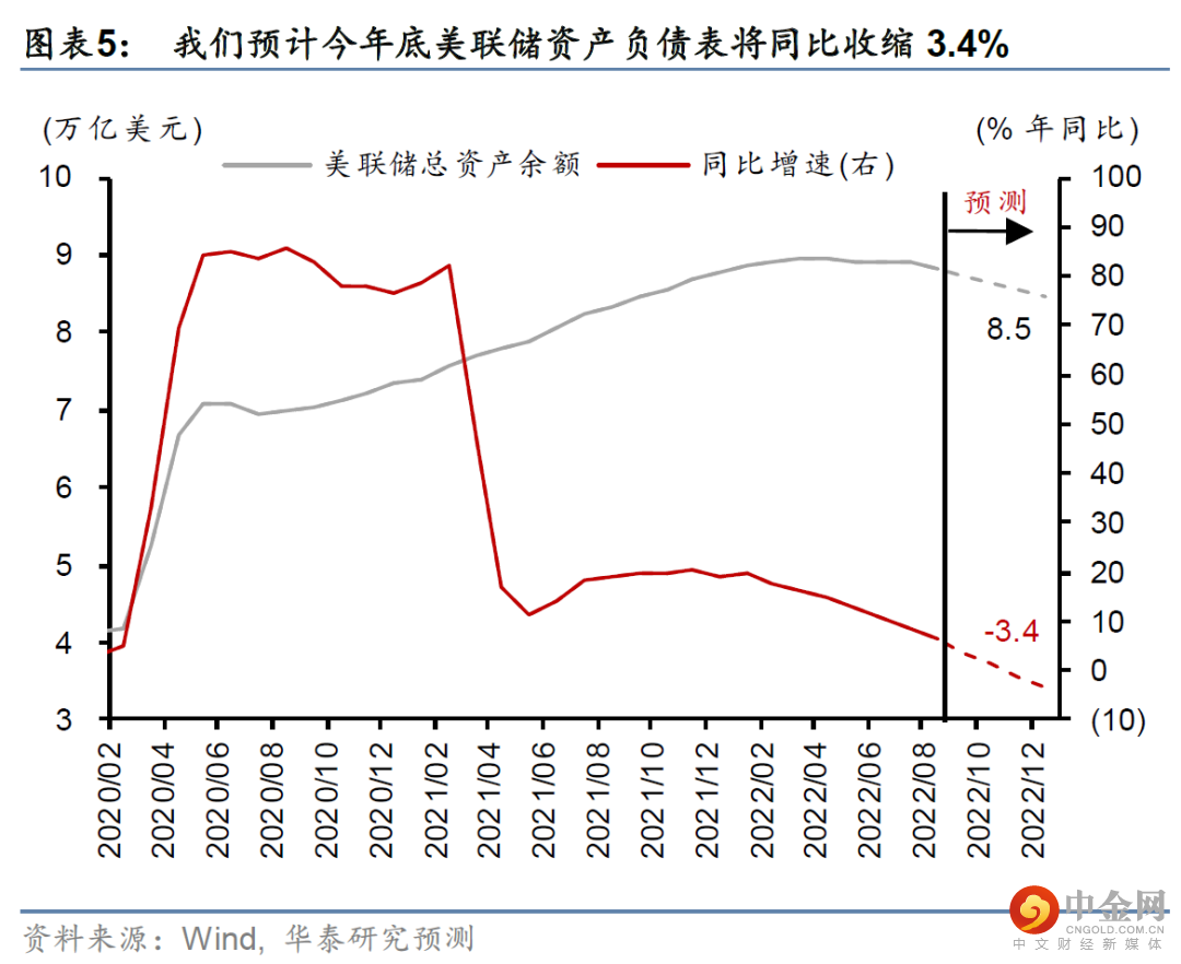 9月后联储开始“真正缩表”,美元流动性紧缩加剧。根据美联储公布的缩表路径,9月开始每月缩表上限将从6-8月的475亿美元提高到950亿美元,我们预计今年底美联储资产负债表将从8月31日的8.83万亿美元降至8.5万亿美元、同比收缩3.4%(图表5)。此前7-8月,虽然美联储按计划削减了国债持仓,其国债持仓累计下降689亿美元,超出预设的300亿美元/月的缩减规模,但美联储MBS持仓基本持平,而美联储计划每月削减175亿美元。