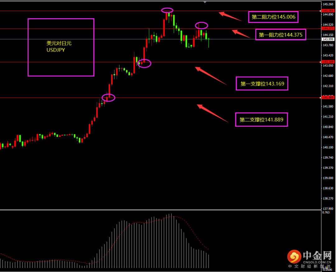 天图美日收阳线,价格虽有冲高,但上影线较长,上行多头有所减弱而空头有所增强,短期连续冲高后面临调整,日内更多以试探性逢高看空为主。小时图美日期间上行幅度放缓,MACD大幅下滑,多头减弱,短期上方有大阴线回落,空头有所增强,日内更多以逢高看空为主。