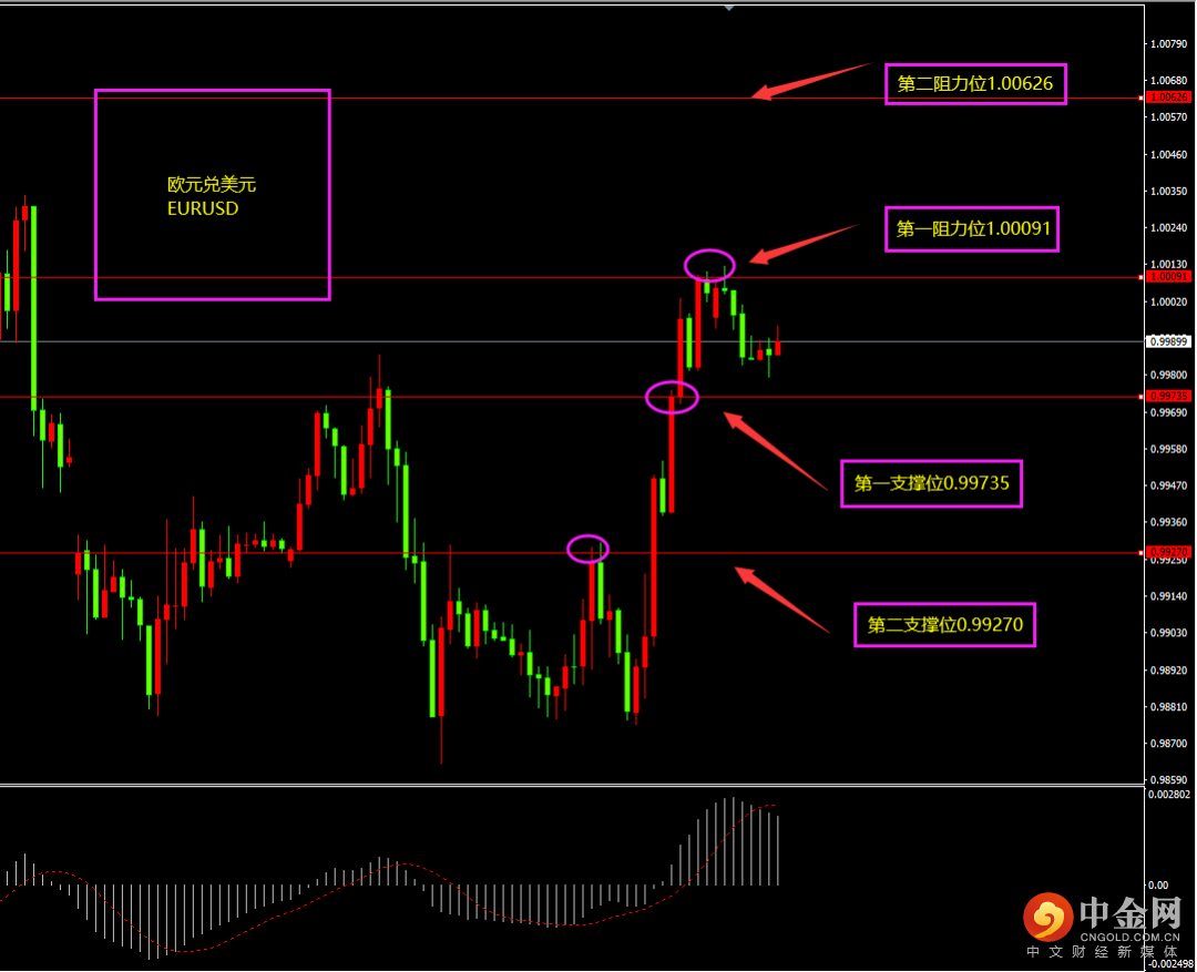 天图欧元收大阳线,价格大幅冲高,多头有所增强,短期下行力度逐渐放缓,底部形成“底背离”形态,随着多头的增强,日内更多以逢低看多为主。小时图欧元期间连续阳线拉升,MACD转移至0轴之上,多头占优,短期上方有部分阴线回落,更多视为调整,调整之后继续以逢低看多为主。