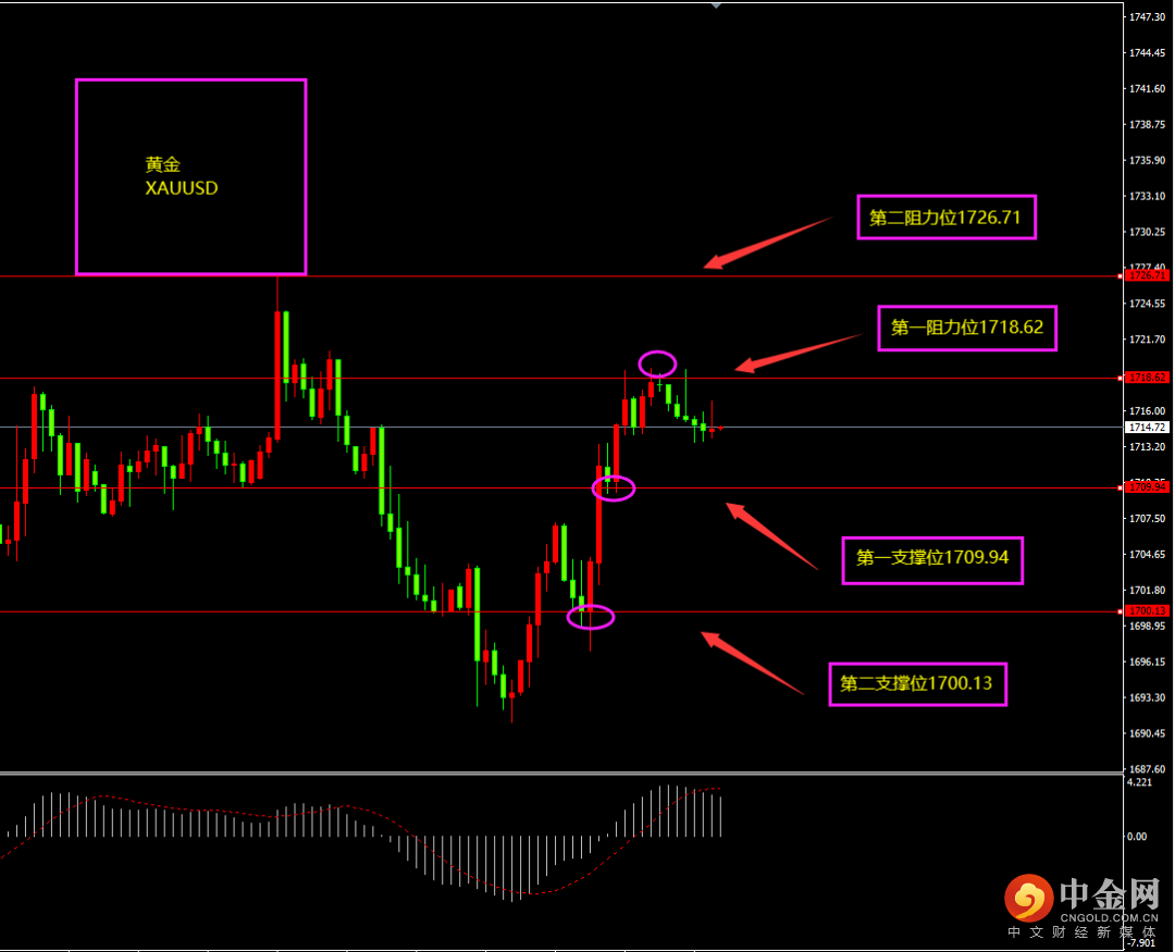 天图黄金收大阳线,价格有所冲高,多头有所增强,短期下影线较长,价格刺而不破,多头增强而空头减弱,随着“双底”的形成,日内更多以逢低看多为主。小时图黄金期间连续阳线冲高,MACD转移至0轴之上,多头占优,短期上方有部分阴线回落,但更多视为调整,调整之后继续以逢低看多为主。