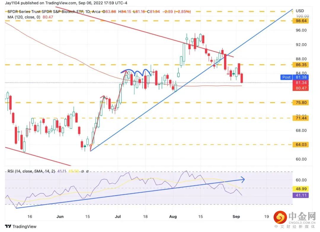 不过如果SPDR生物科技指数基金跌破位于79美元附近的支撑线,我们也会看到此种抛售将愈演愈烈。