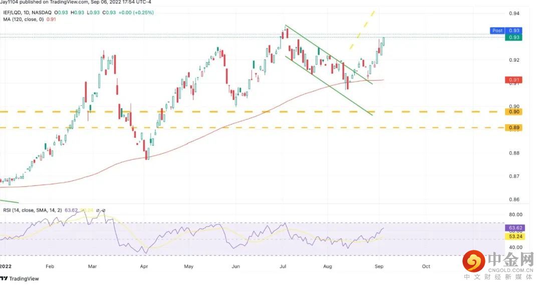 与此同时,iShares 7-10年期美国国债ETF/iShares iBoxx投资级公司债ETF的比值在今天继续上涨,并接近了7月5日所创下的高点。