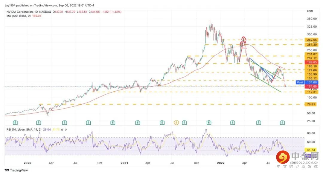 英伟达再次测试位于134美元的支撑线,我对于这种走势没有更多点评。英伟达的股价若跌破该支撑线,我认为该公司的股价会跌向117美元处。