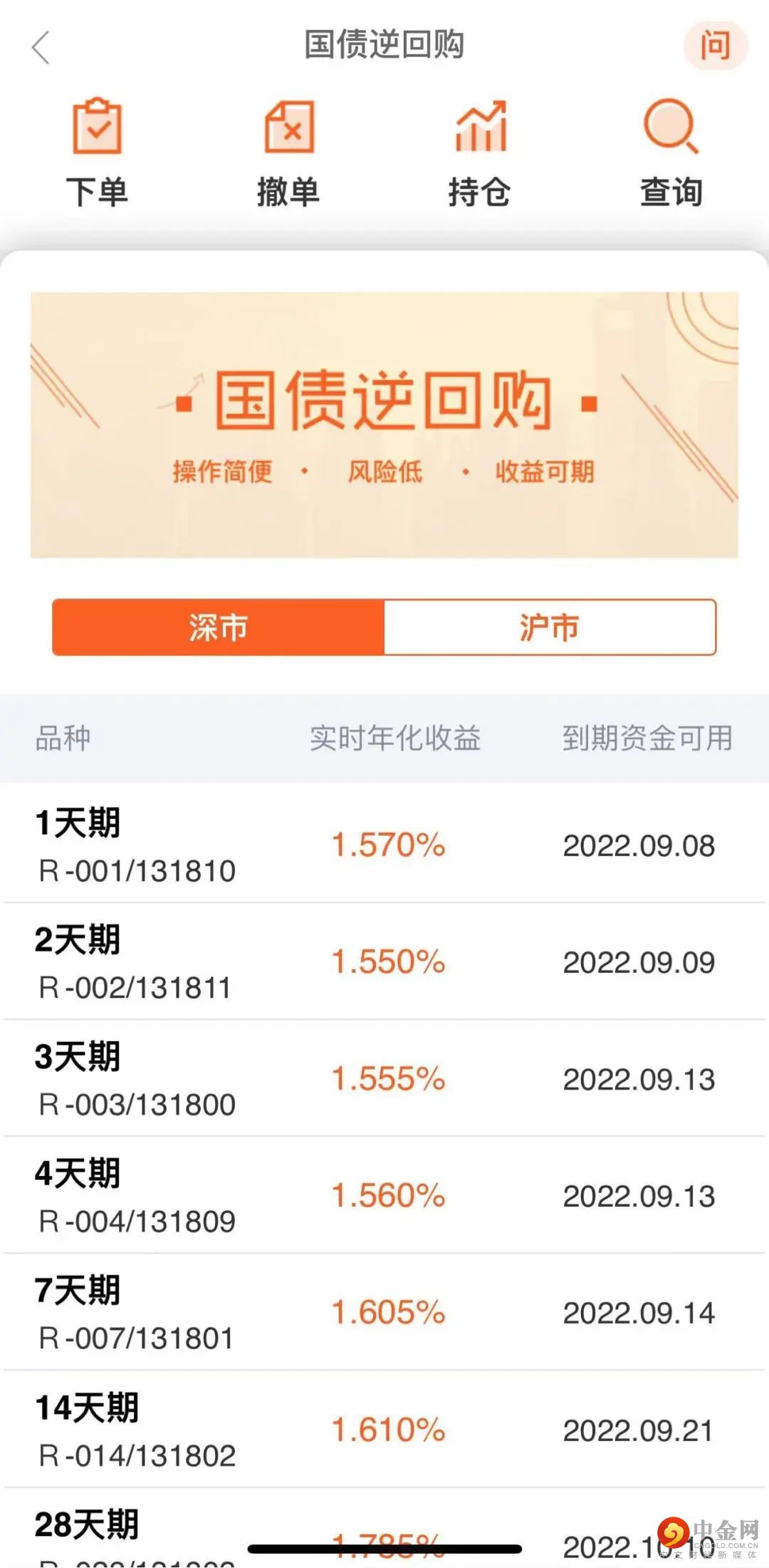 第二步:在国债逆回购首页列表中点击想购买的国债逆回购品种,即可进入“下单”页面。