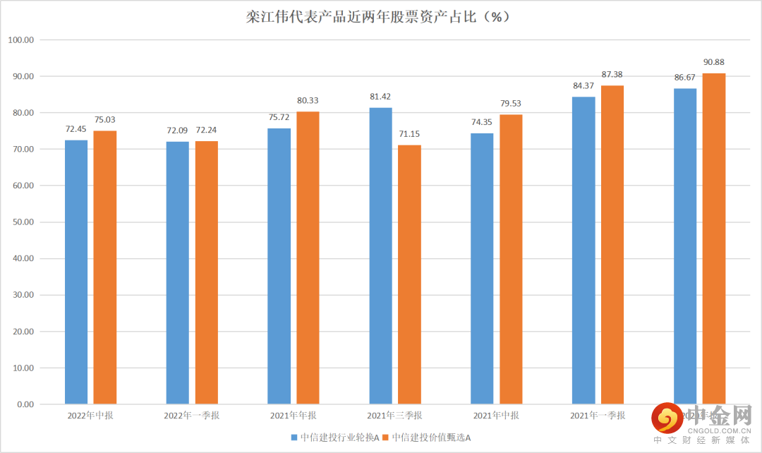 2020年年报至2022年一季报,中信建投行业轮换股票仓位从至86.67%降至72.09%;中信建投价值甄选仓位从90.88%降至72%。