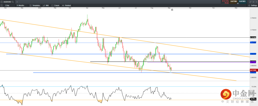 澳元在澳联储洛威放出鸽派信号后迅速回落,当前价格触及0.6716,接近震荡下行通道下轨的低点和7月14日低点0.668。