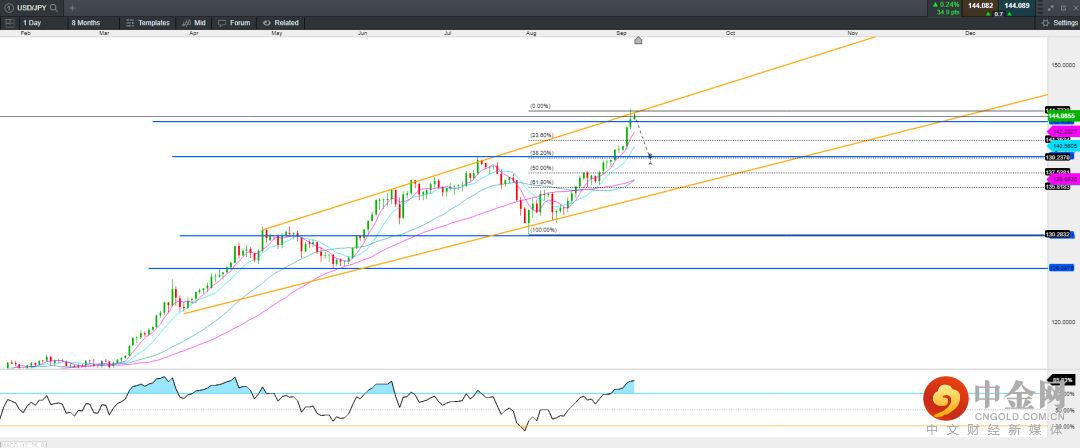 美元兑日元最高触及144.99后回落,当前价格运行于144.06。