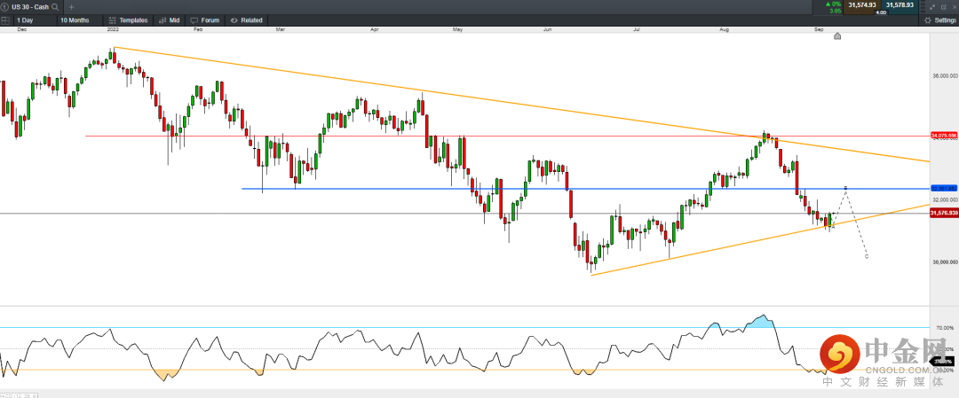 美联储副主席布雷纳德在昨日的发言中强调了过度紧缩的风险,助力道琼斯工业指数昨日在触及31000附近后迎来反弹,录得上涨1.36%。市场目前正在等待下周二(9月13日)的8月通胀数据指引,跌势暂时有所缓解。