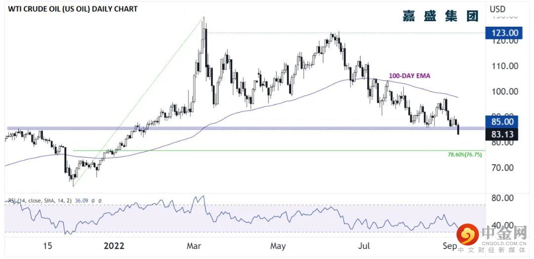 如上所述,油价下破85.00支撑位,跌至近8个月最低点。油价在其下降的100天指数移动均线下方形成系列明显下降的高点和低点,表明过去几个月趋势明显向下。但即使价格创下新低,14天RSI并未进入超卖区域,表明价格或许还有下行空间,然后技术抛压才可能有所缓和。