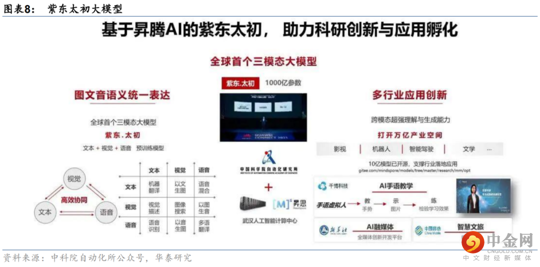 算法方面,支持NLP、CV多模态以及跨模态的通用大模型是本次WAIC体现的重要趋势。阿里达摩院发布最新“通义”大模型系列,可同时处理图像描述、视觉定位、文生图、视觉蕴含、文档摘要等10余项单模态和跨模态任务。中科院自动化所和华为等基于昇腾AI发布的千亿级参数三模态大模型“紫东太初”, 能够实现图像、文本、语音三模态数据间的统一表示与相互生成。百度“文心”大模型支持NLP和CV多模态,以及图文生成、视觉-语言、语音-语言等跨模态生成。