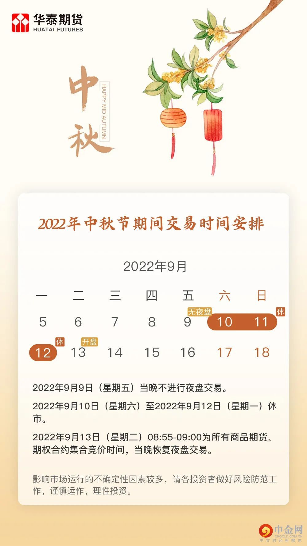 交易提示 | 关于2022年中秋节期间交易时间安排的通知