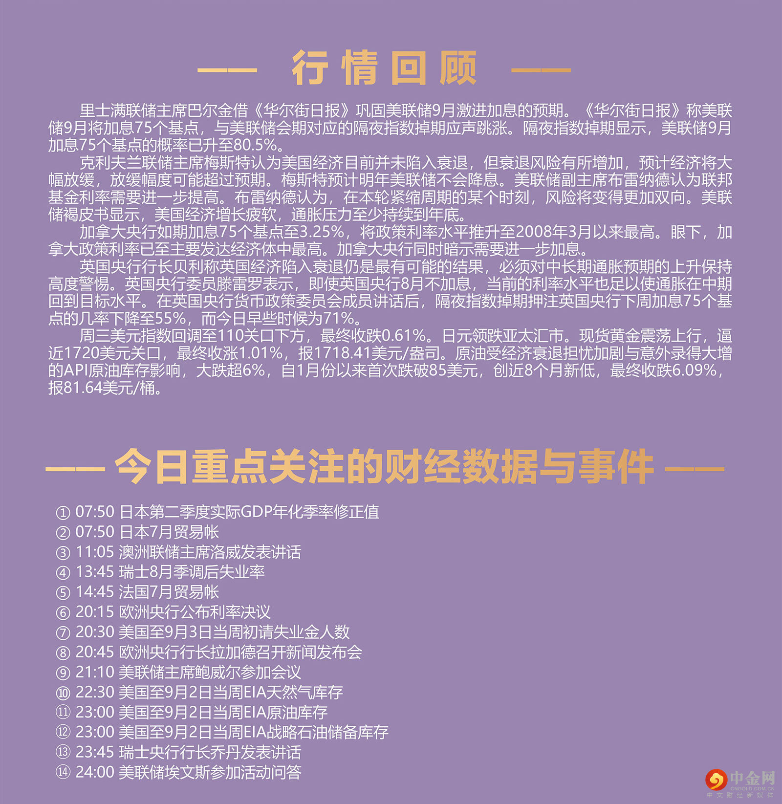 里士满联储主席巴尔金借《华尔街日报》巩固美联储9月激进加息的预期。《华尔街日报》称美联储9月将加息75个基点,与美联储会期对应的隔夜指数掉期应声跳涨。隔夜指数掉期显示,美联储9月加息75个基点的概率已升至80.5%。 克利夫兰联储主席梅斯特认为美国经济目前并未陷入衰退,但衰退风险有所增加,预计经济将大幅放缓,放缓幅度可能超过预期。梅斯特预计明年美联储不会降息。美联储副主席布雷纳德认为联邦基金利率需要进一步提高。布雷纳德认为,在本轮紧缩周期的某个时刻,风险将变得更加双向。美联储褐皮书显示,美国经济增长疲软,通胀压力至少持续到年底。 加拿大央行如期加息75个基点至3.25%,将政策利率水平推升至2008年3月以来最高。眼下,加拿大政策利率已至主要发达经济体中最高。加拿大央行同时暗示需要进一步加息。 英国央行行长贝利称英国经济陷入衰退仍是最有可能的结果,必须对中长期通胀预期的上升保持高度警惕。英国央行委员滕雷罗表示,即使英国央行8月不加息,当前的利率水平也足以使通胀在中期回到目标水平。在英国央行货币政策委员会成员讲话后,隔夜指数掉期押注英国央行下周加息75个基点的几率下降至55%,而今日早些