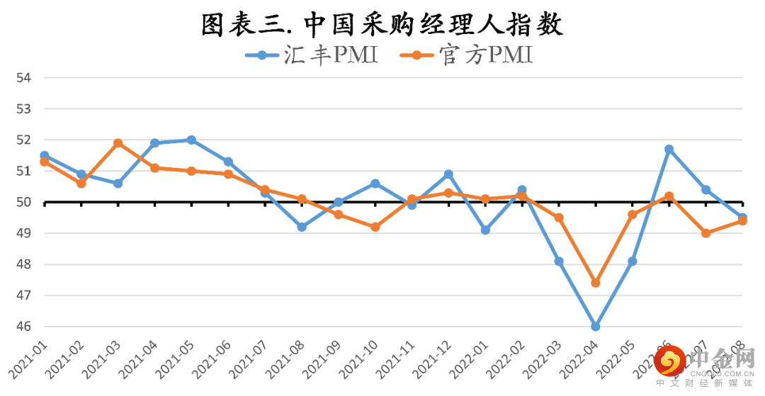近期国内疫情再次出现了一次较为广泛的增加。这对于3季度中国的投资和消费增速都会再次造成一定的负面影响。而且在9月初公布的中国采购经理人PMI指数中,可以看到,无论是官方PMI还是汇丰PMI,在经历6月份的短暂反弹后,都在8月以后再次跌入到了50以下的区间(图表三)。这也说明了中国经济仍处于较为疲弱的状态。虽然我们看到了国务院及下属多个部委近期密集出台了多项旨在提振经济的政策措施,虽然这些措施在部分领域,尤其是提振基建投资和新能源汽车销售方面取得了一定的效果,但我们认为,在疫情动态清零目标依然严峻,叠加了房地产和居民消费下滑的中长期负面影响,以及地方财政紧张造成的支出能力的下降,短期内想要扭转国内这种经济不利的局面依然存在着较大困难。