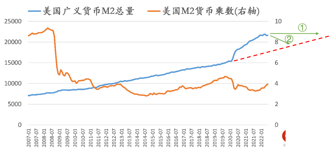 当前的主要问题是:从货币角度分析,联储需要将美国的M2逐渐拉回到此前的增长水平上来,才有可能保证通胀回落到2%的联储目标的货币环境。如图表二所示:联储可以选择不同的路径。