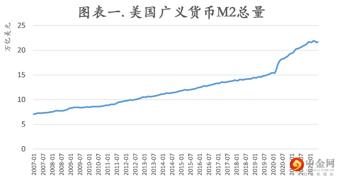 虽然说美国通胀受到了工资水平和油价等多个供给面因素的影响,但是从传统货币通胀学理论逻辑上分析,2020年疫情后美联储采取的极度宽松货币政策和扩张性的财政政策,依然是决定美国通胀水平上升的主要推动因素。这一点在美国的广义货币M2的变化上显得最为突出。从2008年至2020年,虽然美国经历了联储的多轮量化宽松,但是M2的增速总体上是保持稳定的(年化同比增速在6%左右),也是同美国的名义GDP潜在增速水平(5%左右)基本上匹配的。因此美国在这一时期通胀基本稳定在2%左右。而2020年以后美国的M2显著脱离了此前的稳定增长水平,在短短3年从15万亿美元迅速扩张到22万亿的水平,累计增幅接近50%(图表一)。这大大超出了美国经济的潜在增长水平,因此即便从传统的货币通胀理论上看,美国目前经历的高通胀水平也是非常合乎逻辑的。