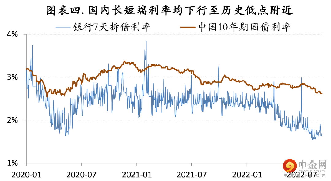 当然,除了乐观政策预期外,支撑国内股市的另一个主要核心因素来自于当前流动性极其宽松的局面。无论是7天回购利率为标准的短期利率,还是以10年期国债为标准的长端利率,国内利率均呈现进一步下行的趋势(图表四)。我们认为,宽松的流动性虽然并不是A股上涨的充分条件,但却能保证A股不出现较为显著的下跌。