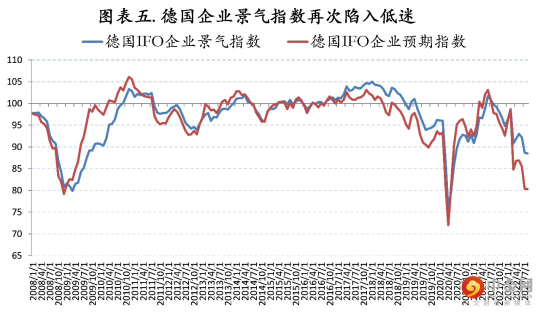随着俄乌战争的延续和乌克兰军队展开反攻,俄国战场所受压力的增加将会进一步推动俄国压缩对欧洲的能源供给,因为这是目前俄国能够反制西方的几乎唯一手段。这不但会使得欧洲的通胀压力进一步上升,也会导致今年冬季欧洲能源短缺问题造成欧洲工业生产和消费能力继续下降。这可能造成几方面的影响:一是欧洲可能被迫继续关停部分工业产能,重点保障民用能源和电力供给。而这就可能造成欧洲整个工业生产水平的进一步下滑,尤其对于德国这样的欧洲主要工业生产国家而言。因此我们看到德国企业景气指数近期持续大幅下滑,陷入到与2008年和2020年初相似的第三次历史低点水平附近(图表五)。