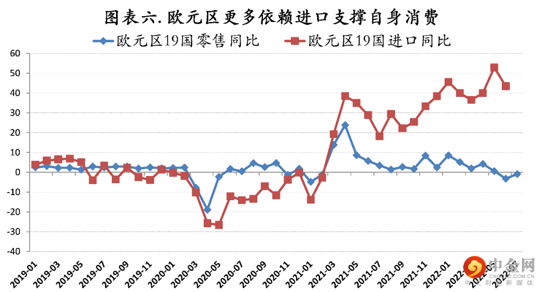 二是欧洲由于能源短缺和制造生产能力下降,不得不转而通过加大商品进口的力度来支撑自身消费需求。因此,虽然我们看到今年以来欧洲整体名义消费增速并没有增长(扣除通胀后的实际消费增速为负),但欧洲进口的增速则保持了接近40%左右的高增速(图表六)。这一方面是因为欧洲进口的能源价格大幅上涨,但即便排除了价格因素,欧洲商品进口量的增速也保持在20%左右,而这很大程度上是因为欧洲自身生产制造能力下滑所导致的。