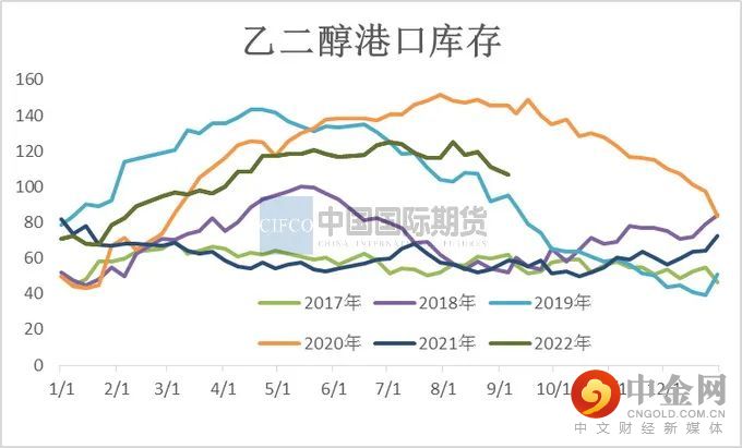 8月底华东主港地区MEG港口库存约106.8万吨,7月底港口库存124.8万吨,8月港口库存较上月下降18万吨。8月供应方面,乙二醇装置陆续兑现减停产计划,供应环节压缩下,乙二醇供需结构持续修复,下游聚酯开工率中下旬已出现明显回升,港口和社会库存出现明显去化。
