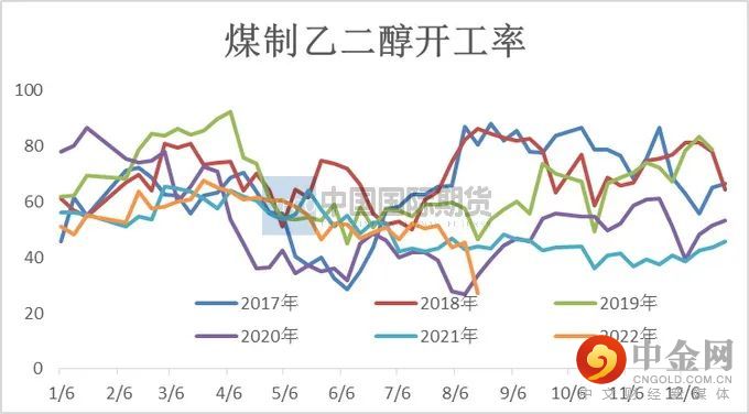 近五年来国内乙二醇产能保持较高增长速度,特别在2021年国内乙二醇产能增速为29.43%,截止8月份乙二醇总产能为2259.5万吨,煤制乙二醇总产能为865万吨。随着检修季到来以及煤制效益压缩,煤制乙二醇装置检修逐步落实,8月起煤制负荷回落明显。8月煤制检修装置:新疆广汇40万吨、陕西延长10万吨、新杭能源40万吨、天业三期60万吨、内蒙古兖矿40万吨、新疆天盈15万吨等。月中煤制乙二醇负荷已下降至27%附近。月底仍有通辽金煤、陕煤渭化装置执行检修,煤化工负荷低位可以至25%略偏下。8月乙二醇煤制平均开工率37.61%,下降11.9%,预计9月上旬起整体开工负荷随装置重启回升为主。