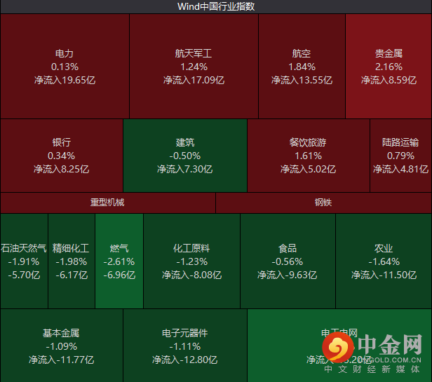 行业板块中,电力板块资金净流入居前,而贵金属、航空、航天军工等内容涨幅靠前,电工电网、半导体等内容领跌。