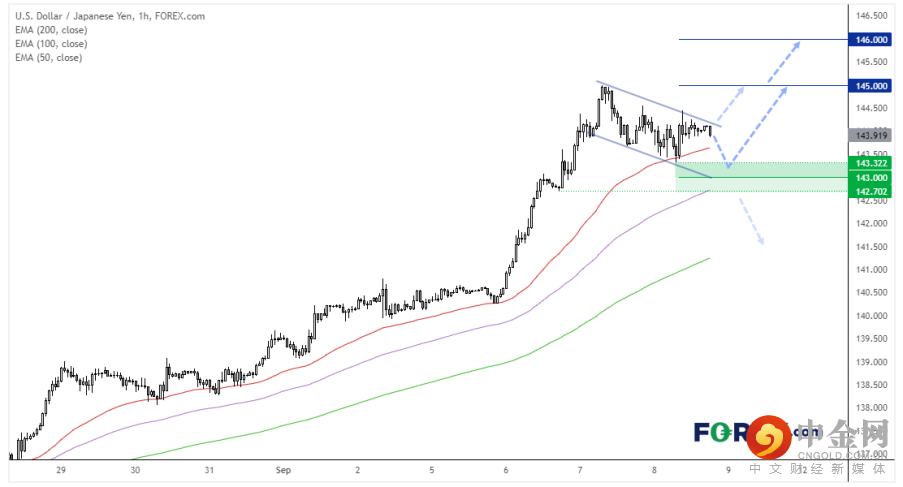 美元/日元小时图可能交投于一个看涨旗形形态内,整体保持强劲的上涨趋势。然而,在如此强力的走势之后,有必要盘整一段时间。所以,价格可能在旗形内回撤后再行冲高。多头可在143上方寻找看涨结构,期待上破,亦可等待站上趋势阻力。站上145,可重点关注146。