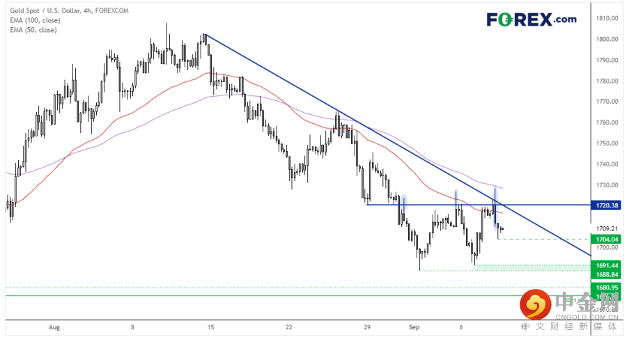 黄金4小时图仍处于下跌趋势中,但过去两周一直在1690 – 1720区间横盘震荡,期间形成的看跌吞噬K线假性突破下降趋势线,也是第三次假上破1720阻力。100期指数移动均线昨天也压制上涨,波段高点或已就位。