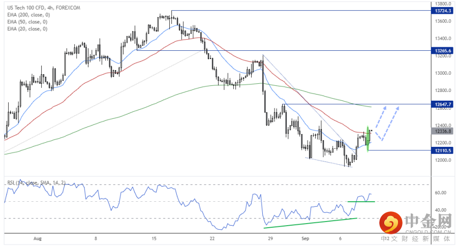 纳斯达克100指数4小时图正尝试构筑上涨趋势。RSI在突破趋势线前出现了看涨背离形态,并且现在高于50,呈现向上的动能。看涨包外K线表明12,110附近筑有买需,也标志着潜在波段低点。守住12,110看涨,后市有望上攻12,600。