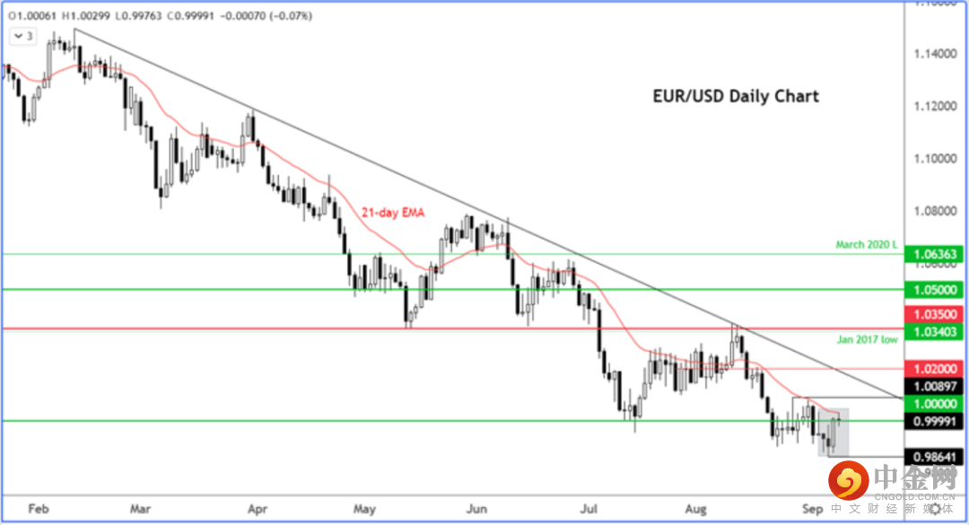 如果看涨,读者有必要关注欧元/美元的收盘价,届时交易员已经消化了欧洲央行决议、拉加德在新闻发布会上的讲话以及鲍威尔的演讲。如果收盘价远高于平价,多头未来几天或有机会。价格目前严重超卖而美元严重超买,欧元/美元当然有喘息的机会。