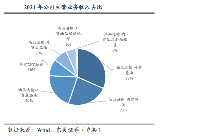 公司是全球领先的油、气运输企业。公司主营业务包括外贸原油和成品油运输,内贸原油和成品油运输,和 LNG运输,以及内外贸油运船舶租赁等其他业务。公司过往利润弹性和载重吨大部分来自外贸原油运输业务的VLCC(超大型油轮 LNG运输业务和内贸原油和成品油运输则贡献较为稳定的毛利,外贸成品油因年初景气度跳升预计2022年能够贡献较好收益。