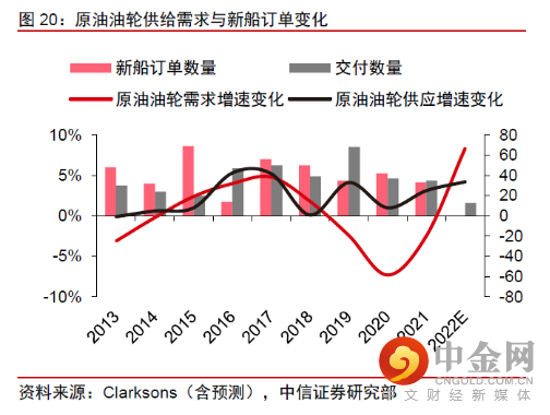 3)因为去年全球供应链危机使得集运和 LNG运输行情较景气,集装箱和 LNG运输船新订单占比较高,造船厂产能饱和限制远期运力供给增长。