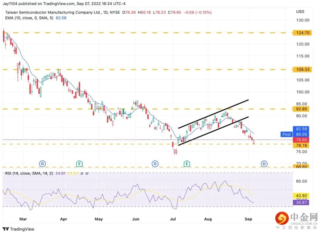台积电一直是值得关注的表现优异的股票,因为该股票往往是一个很好的领先指标。台积电股票在78美元处有支撑线,如果跌破这一支撑线,则下一个需要观察的水平线是位于75.50美元处的缺口,同时也是7月的低点。
