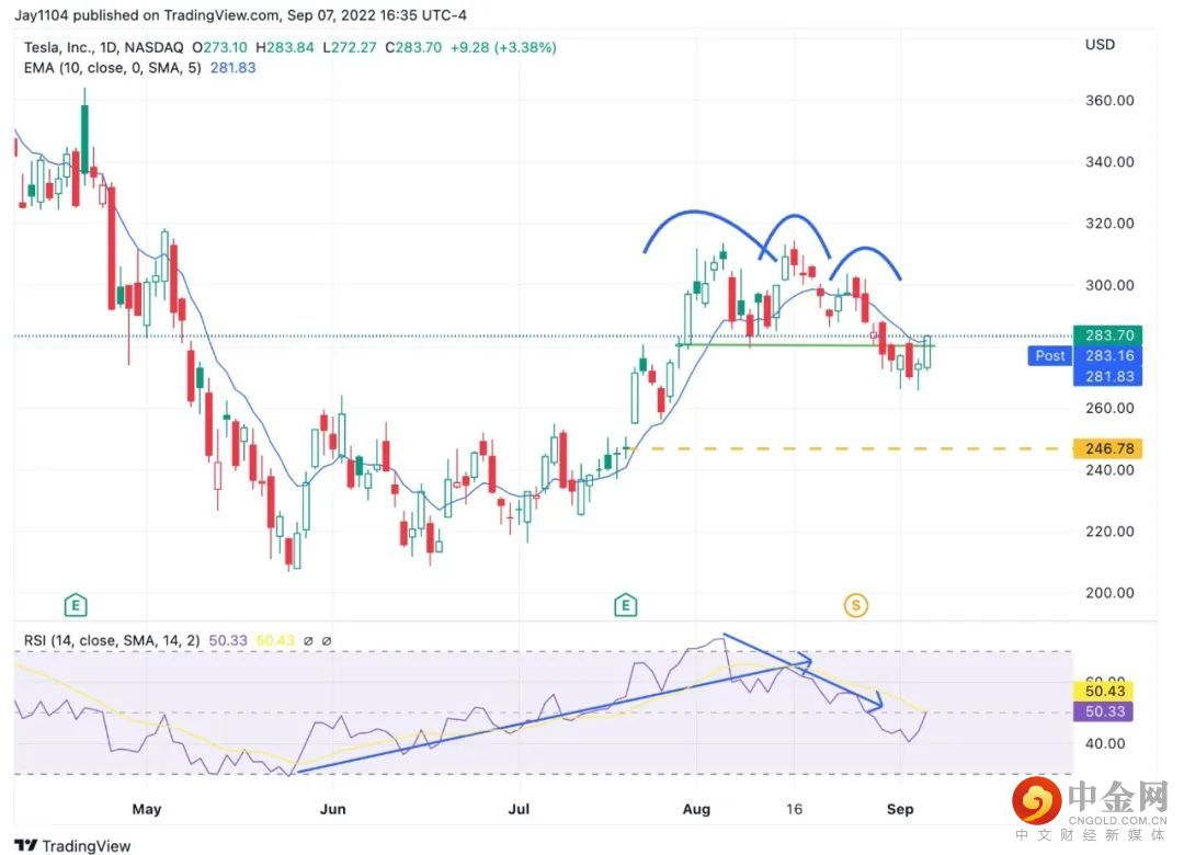 特斯拉的股价今天上涨,引起质疑我成特斯拉跌破头肩形态的颈线的点评。答案是我并没有如上的论断。我可能将颈线划的过低,当然这并不能改变需要填补247美元处缺口的事实。所以,最后在下一步的下挫出现时改变我的思考过程。