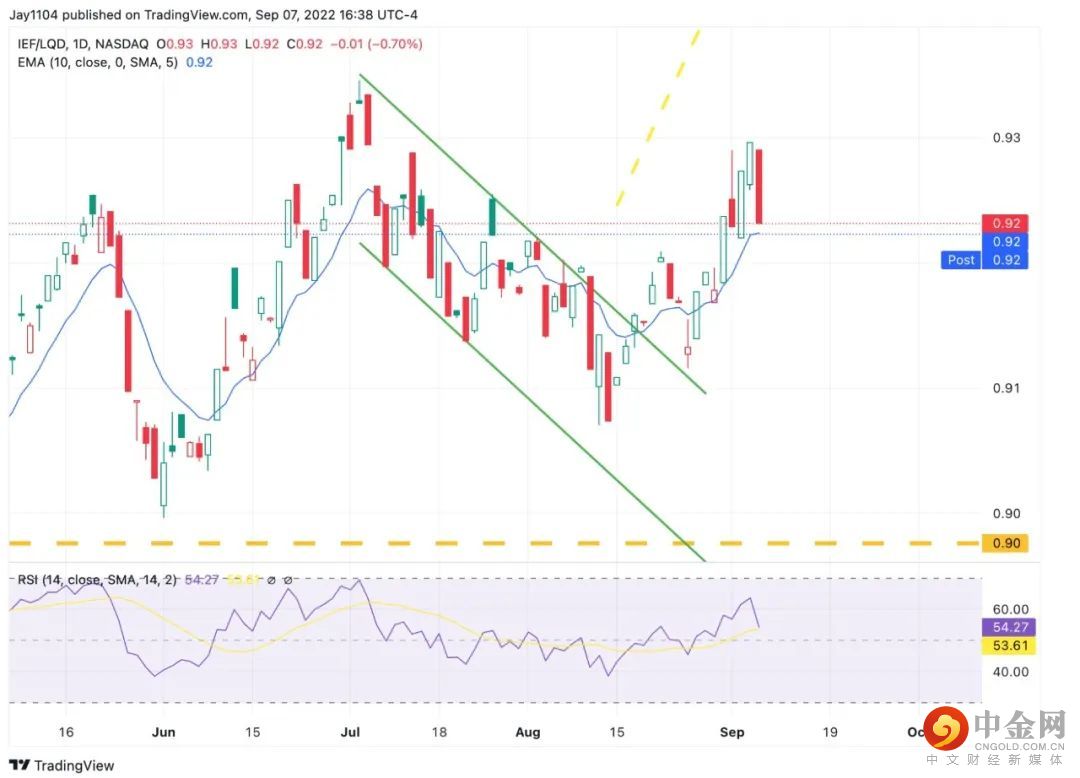 鲍威尔不可能承担得起鸽派演讲的代价。iShares 7-10年期美国国债ETF/iShares iBoxx投资级公司债ETF的比值在一天之内抹去了三天的涨幅,也就是说,收紧金融状况需要花三天时间,一天之内就回到了开始的水平。