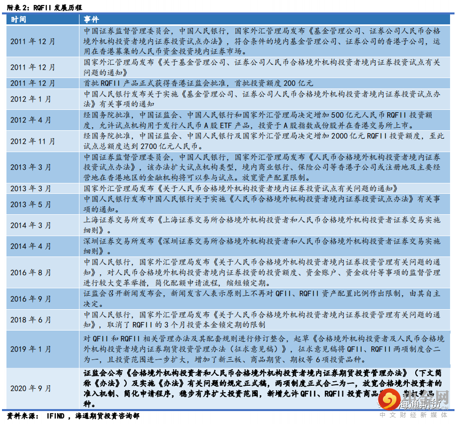 2002 年 QFII 制度正式推出,2011 年 RQFII 试点推出,QFII 和 RQFII 制度发展演变见证了