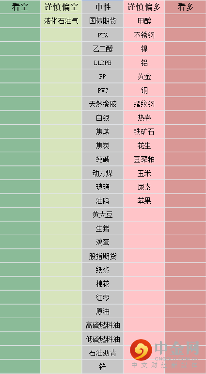 商品期货:农产品谨慎偏多;原油及其成本相关链条、内需型工业品(黑色建材等)、有色金属、贵金属中性;