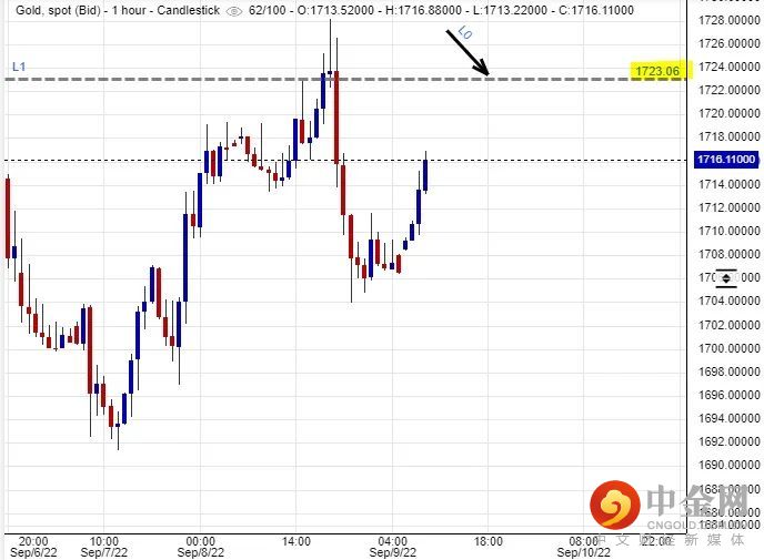 可以部署在$1,723美元左右建立淡仓盘,短线看淡金价一线至$1,690美元水平后止赚,止损在$1,731美元。