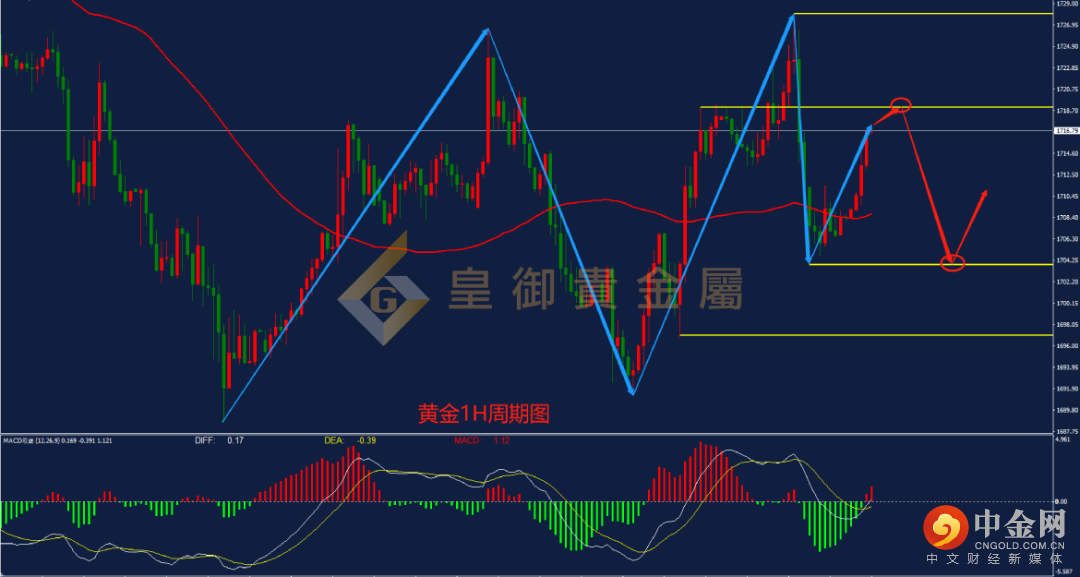 从下图的黄金1H周期图来看,昨日黄金反弹至前面高点压力位1726.5附近后,金价冲高回落,最低下探至1704附近,今日早盘再次迎来小幅拉升。目前黄金整体围绕着60均线上下穿越,MACD也围绕着0轴来回穿越,多空争夺激烈,行情整体围绕着1691-1728区间作宽幅震荡走势格局。日内关注上方仍处于趋势线下方运行,空头趋势还在延续中,日内关注上方压力1719、1728,下方支撑1704、1697,操作上建议高抛低吸为主。
