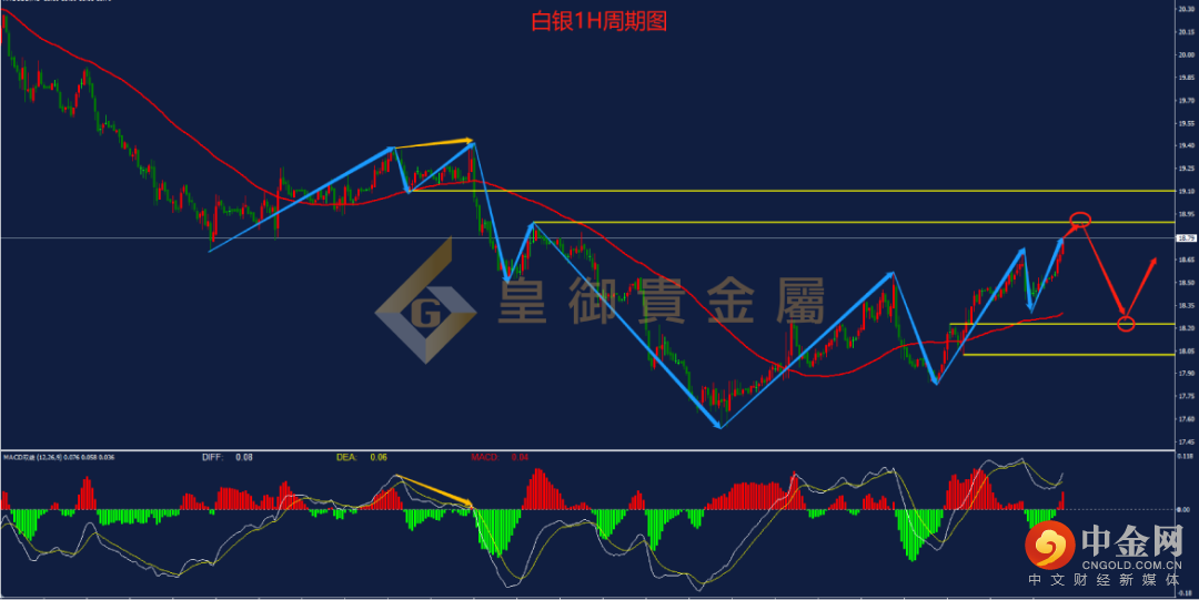 从下图白银1H周期图来看,前期白银经历一波大跌后,在18.70附近小幅反弹至19.41一线,在高位形成MACD顶背离信号,行情再次面临大幅回落,最低下挫至17.54一线,在低位迎来超跌反弹,银价开始沿着60均线震荡上行。目前银价仍在60均线上方运行,MACD也处于0轴上方运行,多头还在延续,日内关注上方压力18.90、19.10,下方支撑18.23、18.02,操作上建议回调做多为主。