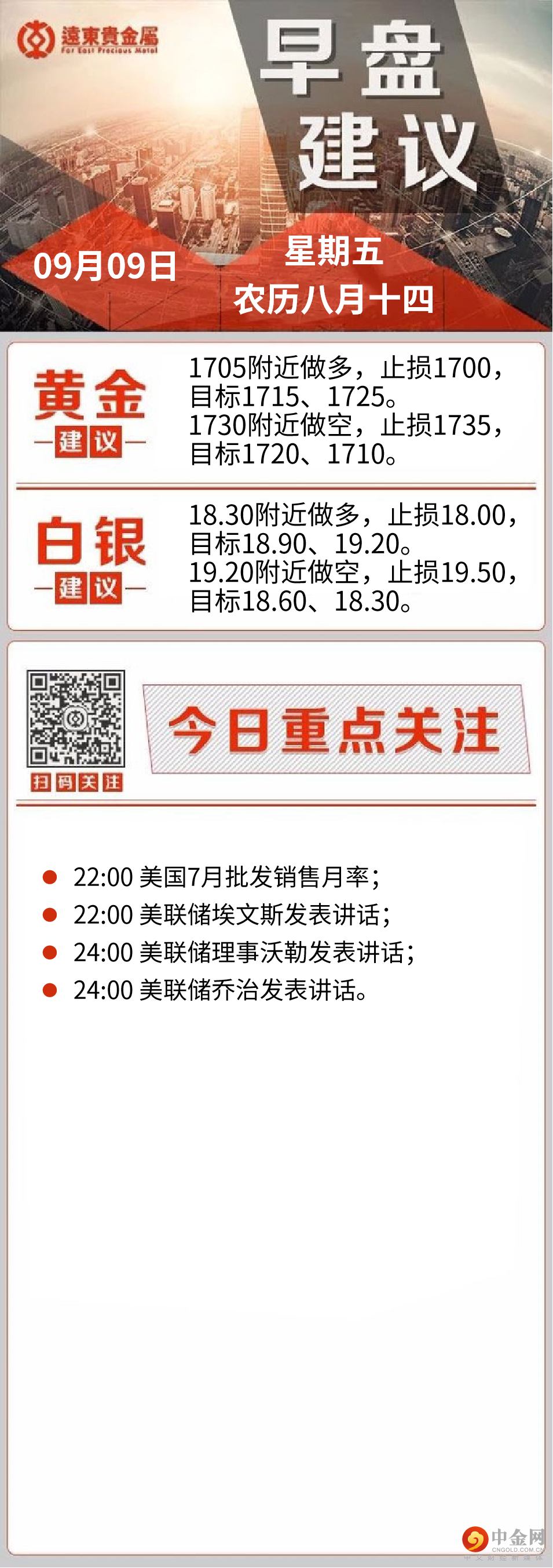 昨日虽然隔夜鲍威尔讲话依然偏向鹰派,但基本符合市场预期,市场预计美联储9月加息概率上升至86%,一度令金价承压至1703附近,但美元多头趁机获利了结,周五更是延续回调走势,一度创逾一周新低至109.12,这给金价提供支撑。此外,全球经济衰退预期尤其是欧元区经济衰退预期挥之不去,也给金价提供避险支撑,短线金价仍有震荡反弹的空间。整体来看,欧洲央行加息75个基点后也会延续加息路径,美联储官员的鹰派讲话和强劲的就业市场数据,美联储9月份加息75个基点已经基本板上钉钉,持有黄金的机会成本会不断增加,这将在中长线限制金价的上涨空间。不过短线而言,随着非美货币反弹,美元指数持续上涨屡次刷新逾20年高点后终于迎来了回调走势,短线仍有进一步回调空间,有望在短线给金价提供上涨动能,而且对地缘局势和欧洲能源危机的担忧、对全球经济衰退的担忧,也有望在短线给金价提供反弹动能。