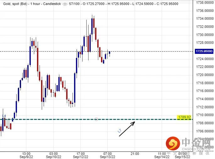 投资者现时仍然把联储局维持积极加息进程与美国通胀程度挂钩,因此,假若今晚稍后时间,美国出台的八月份消费物价指数数据结果是高于预期及上次的话,加息担忧情绪又会增大,有机会压抑投资者买入黄金的风险胃纳,可能会先把金价推低至$1,709美元左右才能找到支持。