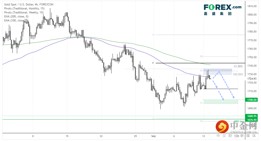 金价在创下1807高点以来不断下跌并形成了下降趋势,但在1690附近企稳。价格此后缓慢走高,似乎走出修正行情。但最近难以守住1720 – 1730一线,或在筑顶。100期指数移动均线、周图第一中枢阻力和斐波纳契位密集区附近出现了一根看跌Pinbar和锤子阴线,价格趋于探至周图枢轴位。如果下破该位,后市重点关注1700支撑区域。